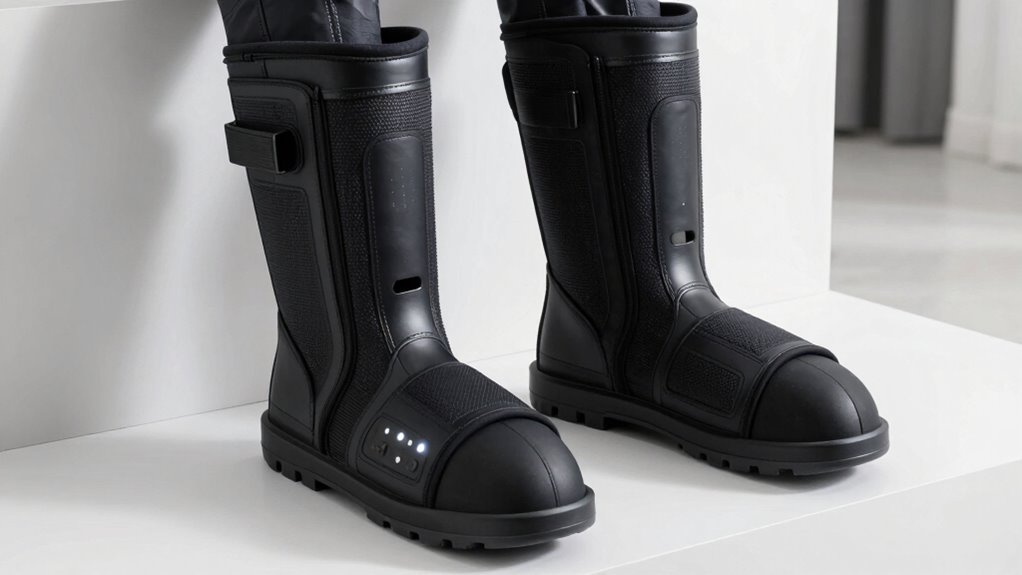 Selecting the right air compression leg massager boots isn’t just about compression levels and modes; a proper fit and comfort are equally vital for effective recovery. Look for boots with adjustable straps or zippers to accommodate different leg sizes comfortably. Some models feature built-in pressure sensors that automatically adapt to your leg contours, guaranteeing a snug yet comfortable fit. Check the available size range, including thigh circumference and calf length, to match your measurements precisely. Prioritize designs made from breathable, soft, and durable fabrics to enhance comfort during extended use. Additionally, even pressure distribution is essential to prevent tight spots and guarantee consistent compression. A well-fitting, comfortable pair of boots makes a significant difference in your recovery, allowing you to relax fully and benefit from the massage.