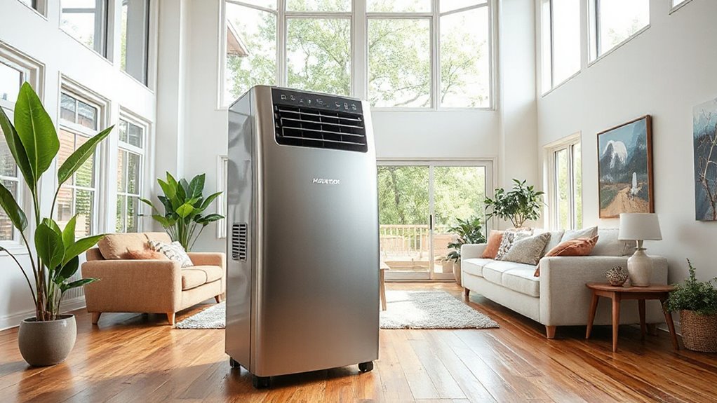 For long-term use, I recommend regularly cleaning the filters and condenser coils to maintain efficiency. You should also empty the water tank if your unit isn’t self-evaporating, and check for dust or debris around vents. Periodic inspections of hoses and seals help prevent leaks. With consistent upkeep, your portable air conditioner stays effective and prolongs its lifespan, ensuring continuous comfort in your large room.