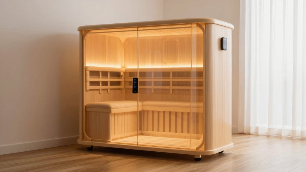 Did you know that portable infrared saunas use up to 60% less energy than traditional saunas? I can tell you they’re pretty energy-efficient. I’ve noticed my unit heats up quickly and maintains temperature with minimal power. Plus, since I only use it for short sessions, it saves energy overall. If you’re looking to reduce your carbon footprint while enjoying health benefits, these saunas are a smart, eco-friendly choice.