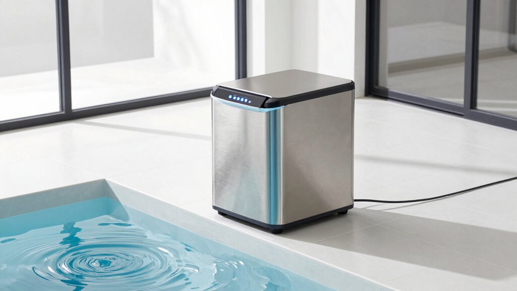 How important is portability when choosing a portable water chiller for your home cold plunge? Very, I’d say. A lightweight, compact design makes it easier to move and store, especially if space is limited. Foldable or inflatable tubs paired with chillers boost overall portability and simplify storage. Look for models with quick, straightforward setup—plug-and-play features help you relocate with minimal effort. Storage options like carry bags or collapsible components protect your equipment when not in use and keep your space tidy. Durability matters too; weather-resistant materials ensure your chiller and tub can handle outdoor storage or variable conditions without damage. Prioritizing these features means your cold plunge setup remains flexible, accessible, and easy to manage, fitting seamlessly into your home environment.