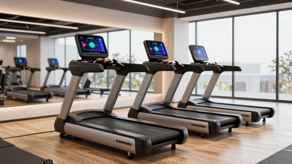 A treadmill’s incline range considerably impacts the variety and intensity of your workouts. I look for models with a wider incline range, like 0% to 15%, because they let me simulate hill climbs and add more challenge to my routine. An incline of at least 10% is great for targeting different muscle groups and boosting calorie burn. Auto incline features are a game-changer, allowing smooth, automatic adjustments that keep workouts seamless and intense. Higher inclines not only increase workout difficulty but also help improve cardiovascular health and strengthen muscles. Plus, customizable incline settings support progressive training, making it easier to adapt as I get fitter. Overall, a good incline range offers versatility and helps keep my daily cardio sessions effective and engaging.