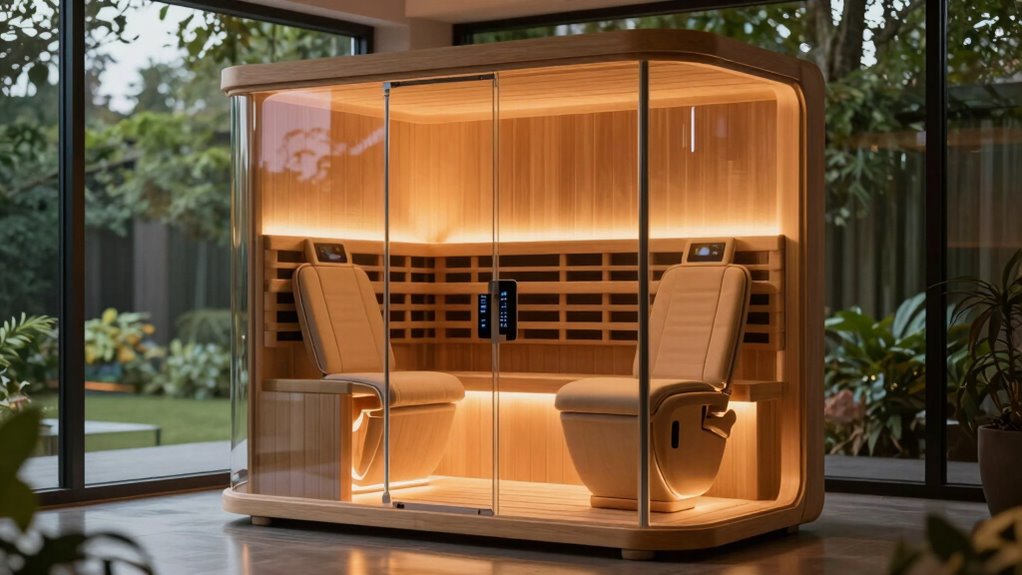 When choosing a two-person infrared sauna, I look closely at the heating technology to guarantee efficient and even warmth. I also consider the size and capacity to make certain it fits comfortably in my space and meets my recovery needs. Finally, I check for safety features and therapeutic light options that enhance the overall experience and security.