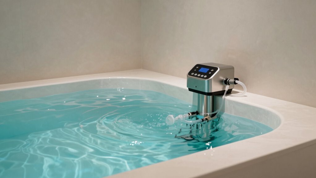 When evaluating recirculating water chillers for cold plunges under $5000, noise level becomes an important factor, especially in home or wellness environments where tranquility is valued. Most chillers operate between 30 to 50 decibels, comparable to a quiet conversation or soft background hum. Lower noise levels are vital for creating a peaceful atmosphere during relaxation or recovery. The type of compressor and cooling technology plays a big role, with inverter compressors generally producing less noise than traditional models. Features like insulated enclosures, sound-dampening materials, and vibration isolation can further reduce operational noise. Always check the product specifications for maximum decibel ratings to guarantee the chiller aligns with your noise expectations and maintains a calm environment.