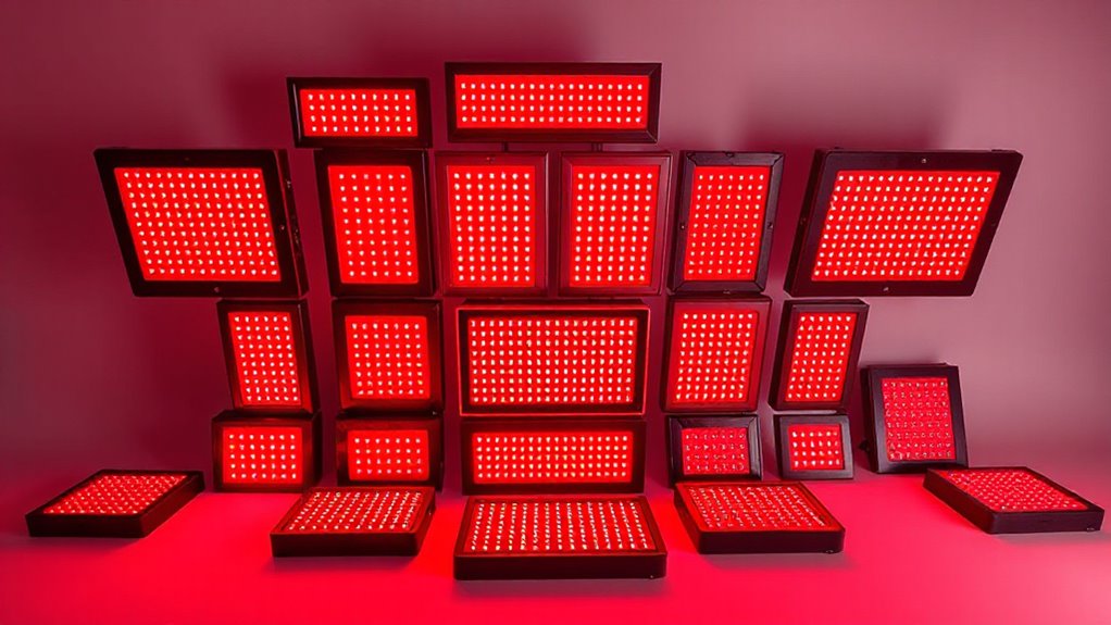When selecting a red light therapy panel under $3000, considering its size and portability is essential for seamless integration into your routine. Think about the overall dimensions and weight—these affect how easily you can move or store the device. Lightweight panels with handles or stands make setup and repositioning effortless. Features like adjustable stands, hanging kits, or flexible mounts help adapt the device to different treatment areas or spaces. Smaller, compact panels are perfect for targeting specific spots, while larger units support full-body treatments. If a device isn’t portable enough, it could limit your ability to use it in various locations or during different activities, reducing its overall convenience and effectiveness.