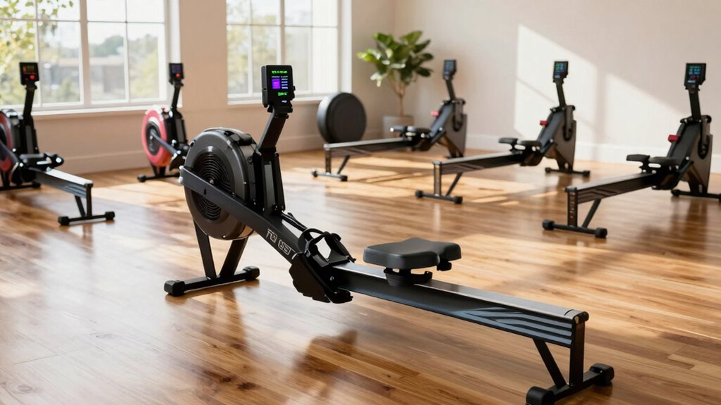 Selecting a rowing machine that fits well into your home gym means paying close attention to its design features, especially if space is limited. Many space-saving models have foldable or vertical storage options, allowing you to maximize limited areas. Compact designs typically measure under 50 inches in both length and width, making them ideal for small spaces. Built-in transport wheels make moving and repositioning the machine simple, whether for storage or workout setup. Some units even offer vertical or upright storage modes, reducing their footprint by up to 70% when not in use. Multi-functionality, like foldable seats and collapsible frames, further helps you optimize space without sacrificing workout quality. These features are essential for maintaining an effective home gym in tight spaces.