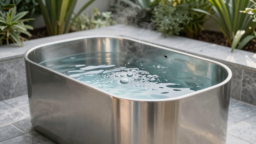 You’ll need about 4 to 6 feet of space in both width and length to comfortably install a stainless steel cold plunge tub. I recommend leaving extra room for easy access, maintenance, and safety. Keep in mind that some models are compact, while others are larger, so check the specific dimensions before purchasing. Planning for adequate space guarantees you can enjoy your plunge tub without feeling cramped.