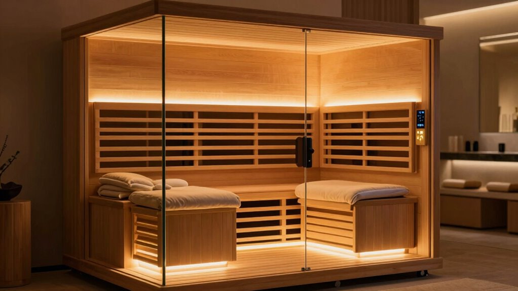 Adding wellness features like red light therapy, chromotherapy, and negative oxygen ion controllers can substantially enhance your sauna experience. Red light therapy with specific wavelengths, such as 660nm, promotes muscle recovery, reduces soreness, and boosts circulation. Chromotherapy lighting with multiple color options can elevate your mood, lower stress, and create a calming atmosphere, making your sessions more relaxing. Integrated negative ion generators and aromatherapy ports support respiratory health and overall well-being, adding a multi-sensory dimension to your relaxation routine. These extra features reflect a more holistic approach to health, going beyond just infrared heat. They turn your sauna into a all-encompassing wellness tool, providing targeted benefits and a more immersive, therapeutic experience that can be tailored to your mood and needs.