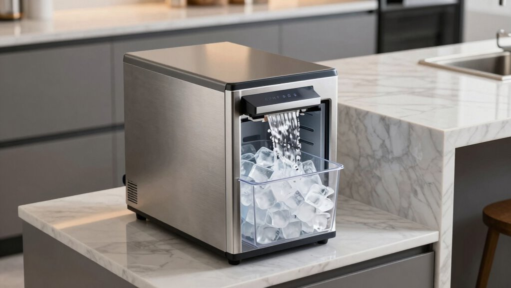 The clarity and purity of ice are essential factors to contemplate when choosing an undercounter ice maker for ice baths, as they directly impact both safety and cooling efficiency. Clear ice with minimal impurities melts slower, helping maintain a consistent water temperature during baths. Specialized freezing technologies can produce layered, crystal-clear ice by reducing trapped air and impurities. The purity of the water and the ice maker’s filtration system play critical roles in achieving this clarity. High-quality ice should be free of cloudiness, sediment, and odors to ensure safety and comfort. Additionally, the ability to customize ice thickness and size influences how effectively the ice cools the water. Prioritizing ice quality ensures a safer, more efficient ice bath experience.