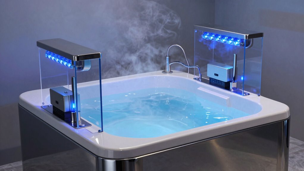 UV ozone improves water clarity by breaking down organic contaminants and neutralizing bacteria. When I use a UV ozone system, I notice the water looks clearer and feels fresher because it effectively reduces algae, odors, and impurities. This process guarantees my cold plunge stays clean without harsh chemicals, making the experience more enjoyable. I highly recommend UV ozone for maintaining pristine, crystal-clear water in your cold plunge setup.