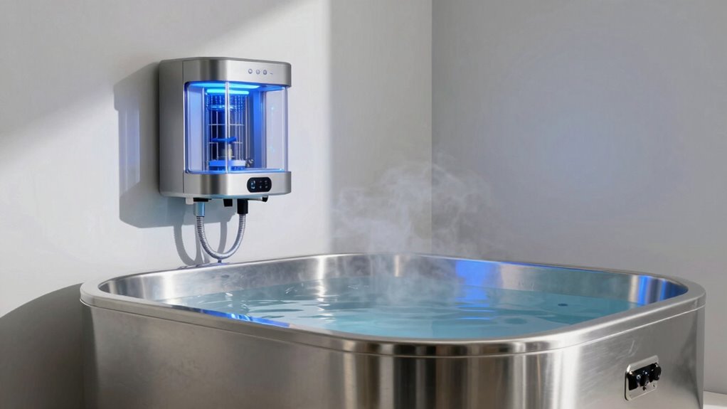 UV ozone treatment doesn’t substantially impact the cold plunge water temperature. I’ve found that its main role is to purify the water, killing bacteria and removing odors. Since UV ozone works efficiently at ambient temperatures, it won’t raise or lower the water’s chill. So, you can enjoy the benefits of cleaner water without worrying about affecting the cold temperature, making your plunge safer and more invigorating.