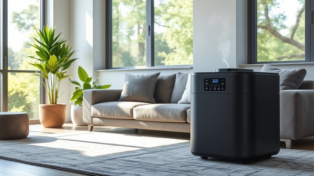 Yes, there are energy-efficient models available for large homes. I recommend looking for humidifiers with variable speed fans and energy-saving features like thermostatic control and low power consumption modes. These models use less electricity while maintaining ideal humidity levels, saving you money on energy bills. I’ve found that selecting ENERGY STAR-rated units also helps guarantee you’re choosing efficient, environmentally friendly options suitable for large spaces.